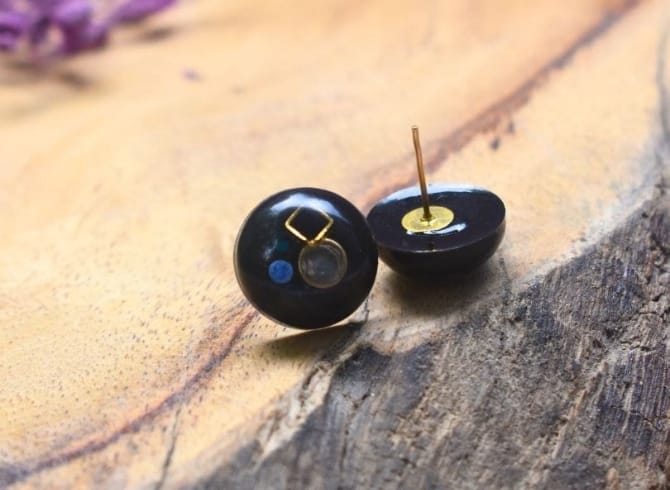 Design Inspiration: The deep, lustrous black resin captures the essence of understated glamour, creating a bold yet refined statement. These round earrings are a celebration of simplicity, allowing you to express your style with a touch of modern chic.