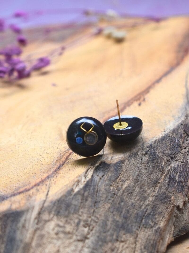 Design Inspiration: The deep, lustrous black resin captures the essence of understated glamour, creating a bold yet refined statement. These round earrings are a celebration of simplicity, allowing you to express your style with a touch of modern chic.