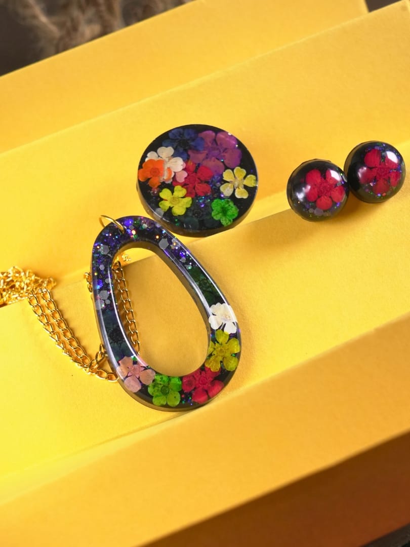 Design Inspiration: Inspired by the allure of a blooming garden at dusk, this collection captures the essence of twilight magic. Each piece is adorned with a striking black pigment, symbolizing the depth and mystery of the night sky. Within the heart of the ensemble lies a mesmerizing array of multicolored plum dry flowers, delicately preserved to retain their natural beauty and grace. Infused with multi-colored glow-in-the-dark glitter, these accessories come alive with an ethereal glow, evoking the enchantment of fireflies dancing in the twilight hours.