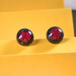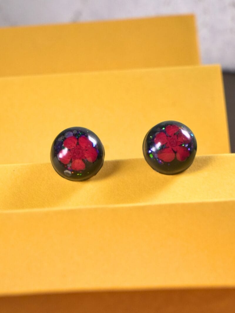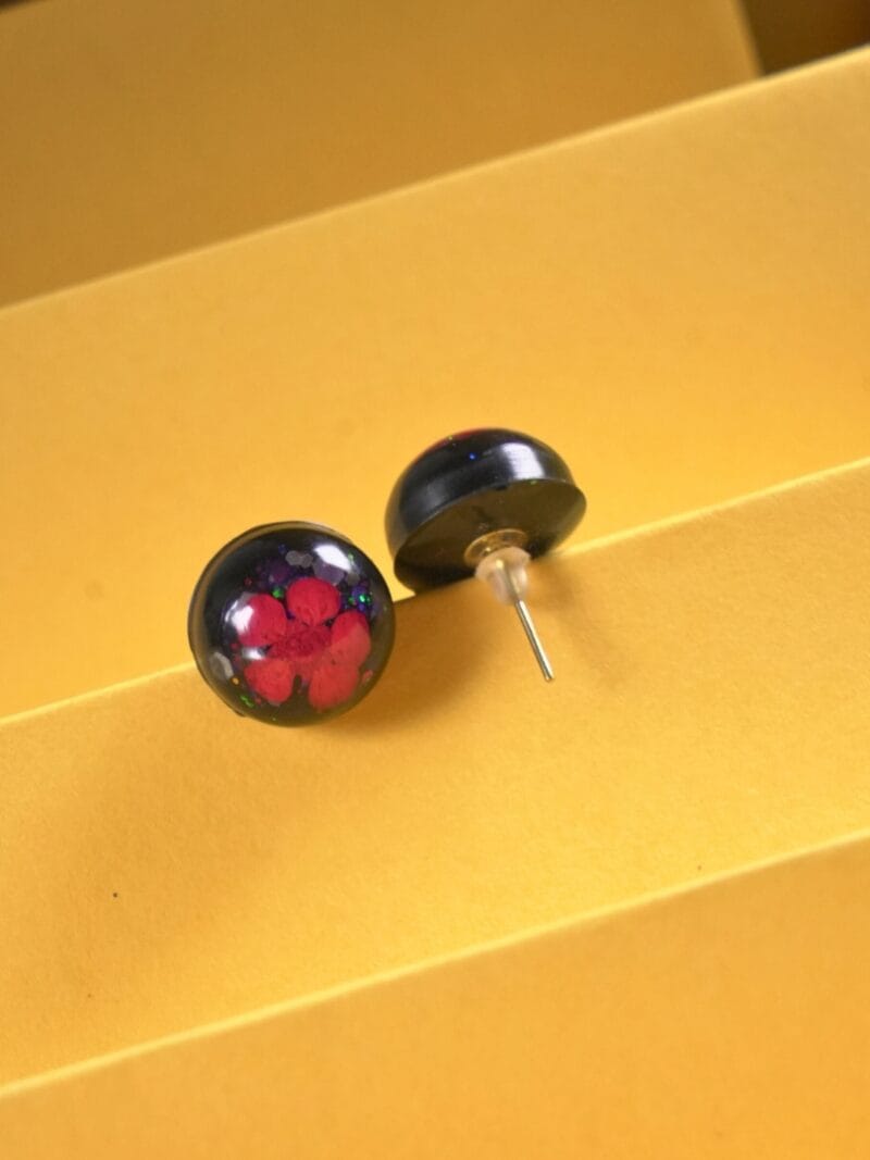 Materials: Resin, Pressed Flower, Glow-In-The-Dark Glitter, Pigment, Gold Plated Flat Post Back