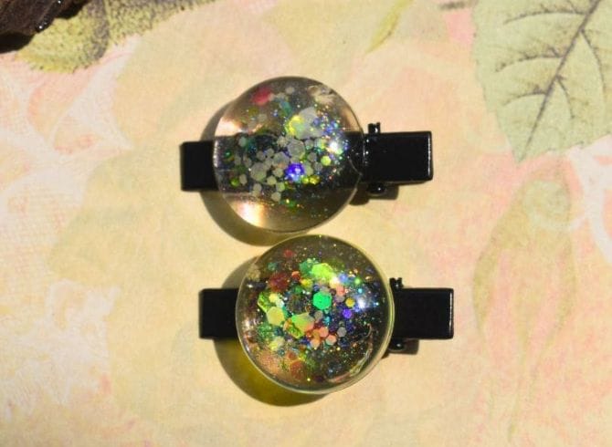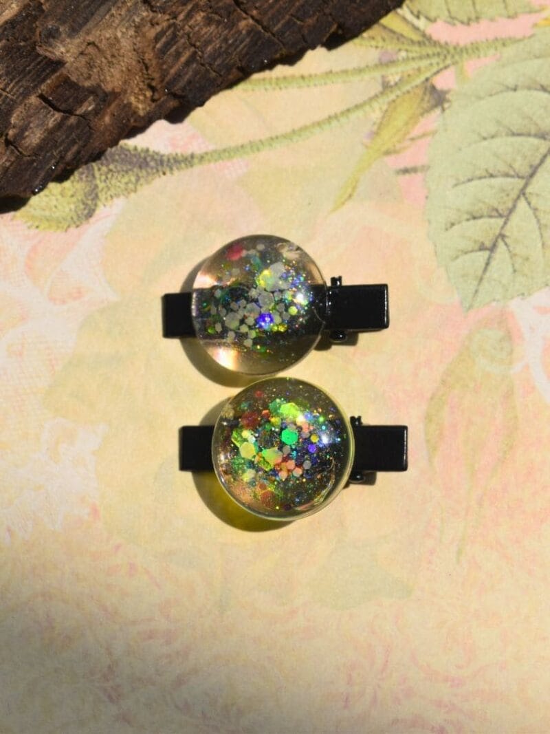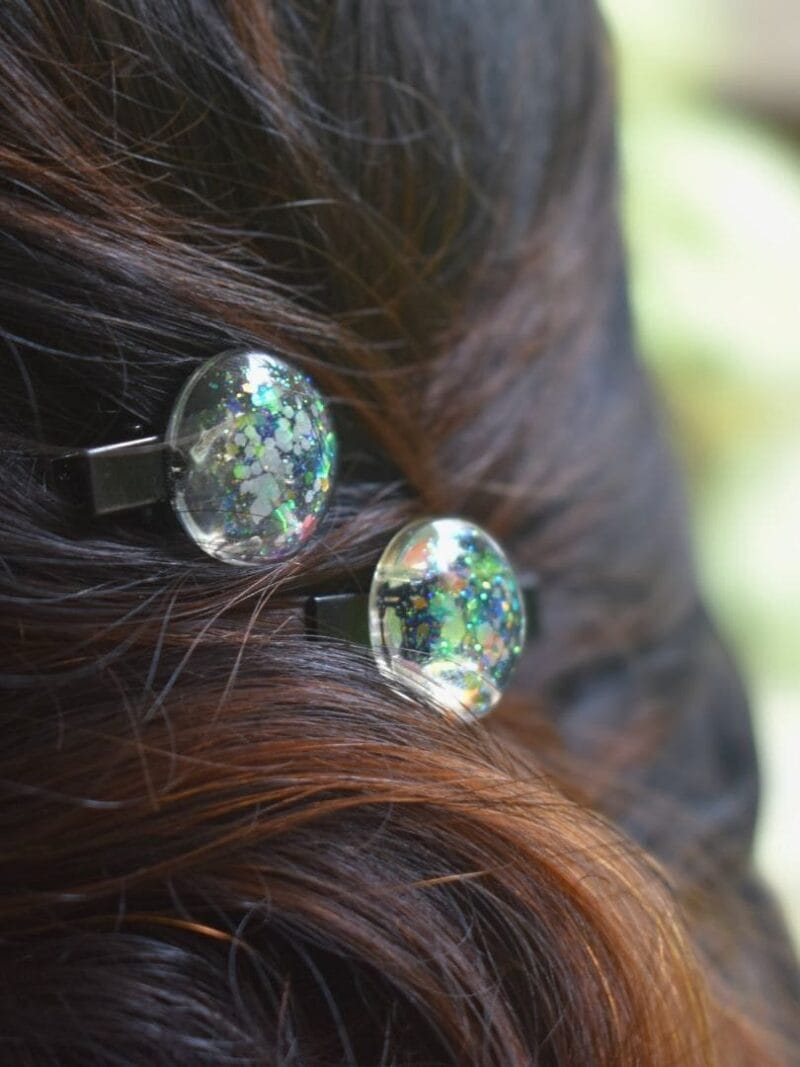 Design Inspiration: Crafted with meticulous attention to detail, this delightful hairpin set features circular designs that radiate playful elegance. The transparent resin base is infused with shimmering multicolor glitter that glows in the dark, creating a captivating effect that’s sure to make you stand out.