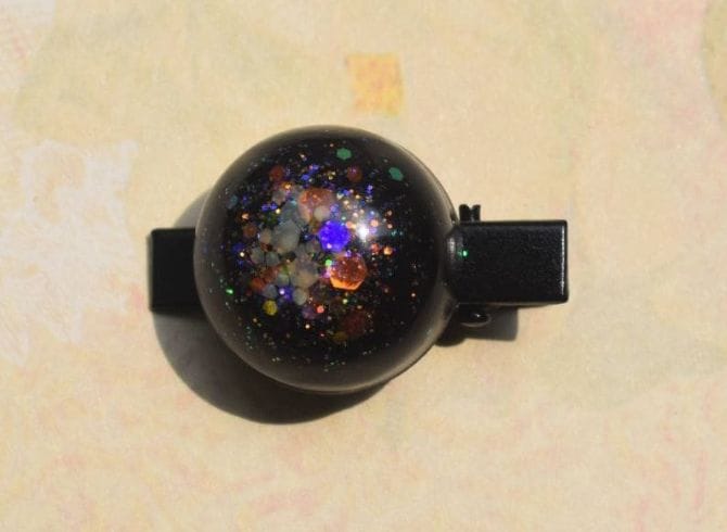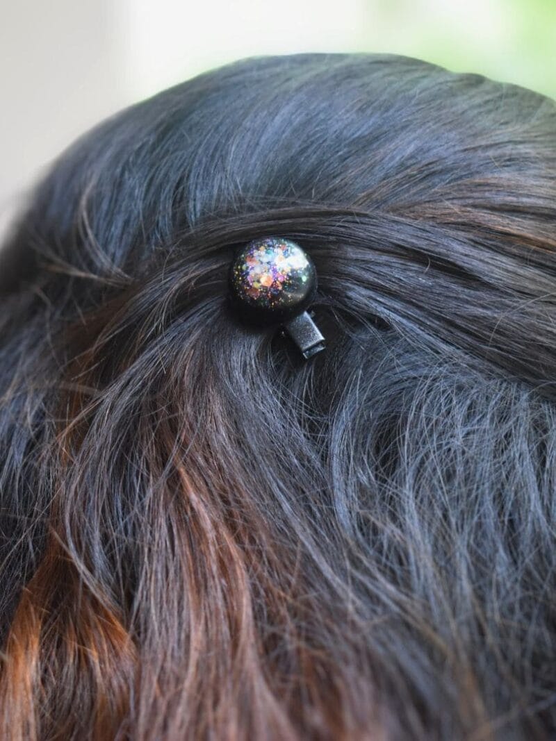 Design Inspiration: Crafted with meticulous attention to detail, this stunning hairpin boasts a classic circular design that exudes timeless elegance. The black-colored resin base serves as the perfect canvas for the shimmering multicolor glitter, creating a mesmerizing effect that’s sure to turn heads.