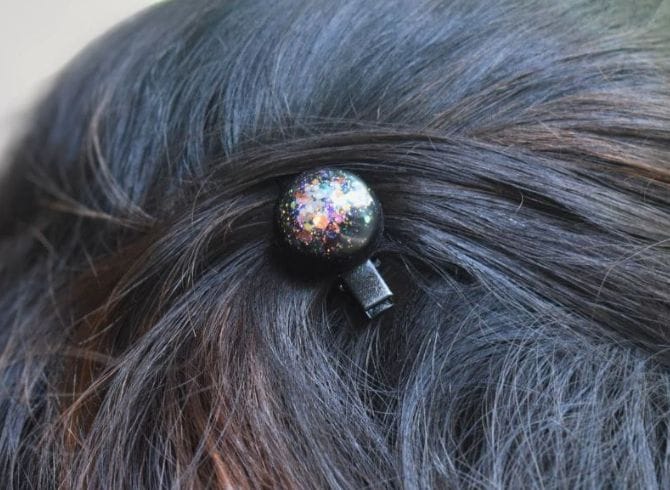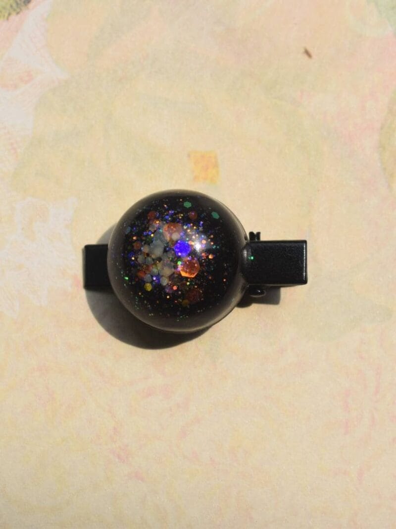 Materials: Black pigment, Multi-colored glow-in-the-dark glitter, Metal hairpin base