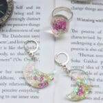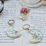Design Inspiration: Drawing inspiration from the mystique of the night sky and the enchanting dance of celestial bodies, each piece in this set radiates with ethereal beauty and celestial grace. This celestial-inspired set features a ring and earrings adorned with multicolor glow-in-the-dark glitter, meticulously crafted into delicate crescent moons infused with the whimsical sparkle of heart-shaped glitter. The multicolor glow-in-the-dark glitter adds a mesmerizing touch, while the heart-shaped accents evoke feelings of love, passion, and cosmic connection.