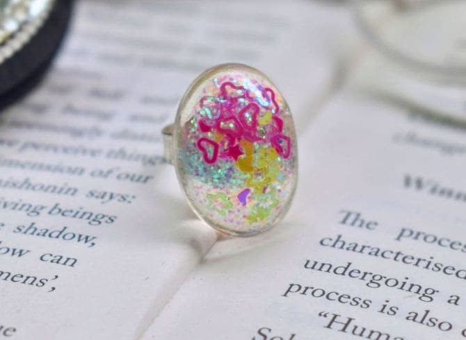 Materials: Resin, Holo Glitter, Heart and Star Inserts, Silver Plated Ring Base