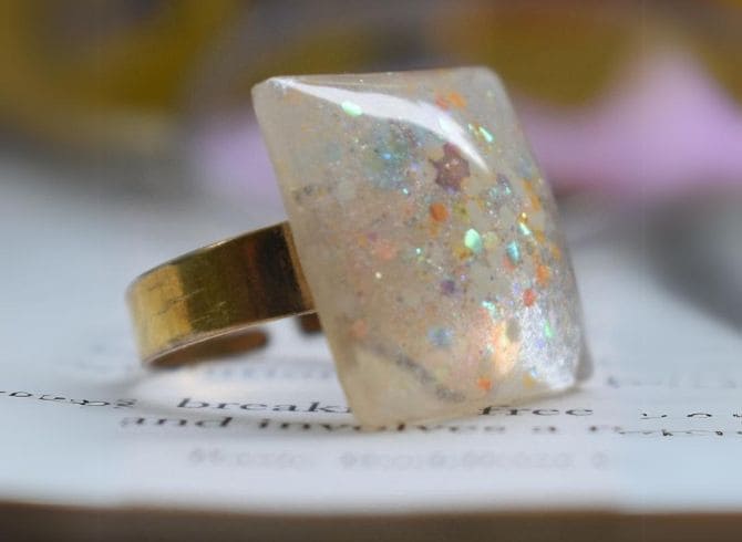Materials: Resin, Holo Glitter, Gold Plated Ring Base