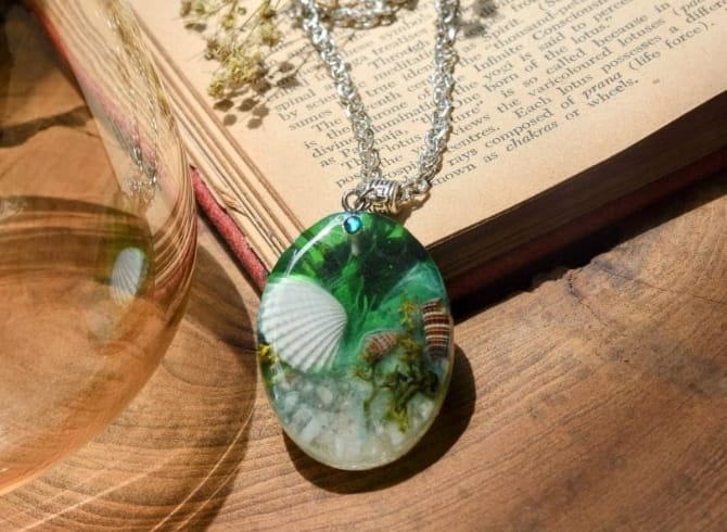 Design Inspiration: Inspired by the mesmerizing allure of the ocean, this pendant serves as a reminder to embrace the natural world and find solace in its calming presence. Crafted with meticulous attention to detail, the oval-shaped pendant showcases a tranquil green resin base embellished with real shells and sand, reminiscent of treasures discovered along the shoreline. The addition of oval-shaped details adds a touch of elegance and sophistication to the piece, creating a captivating aesthetic that celebrates the beauty of nature.