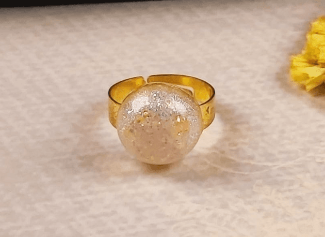 Materials: Resin, Holo Glitter, Peach Pigment, Gold Plated Ring Base