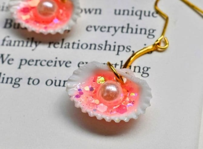 Materials: Resin, Shells, Holographic Glitter, Beads, Gold Plated Hook Wire