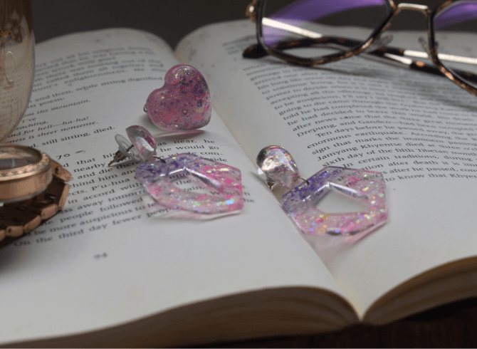 Design Inspiration: Inspired by the enchanting beauty of geometric shapes and vibrant hues, this set is perfect for adding a playful yet elegant touch to any outfit. This charming set features a heart-shaped ring and a pair of earrings adorned with mesmerizing pink and blue glitter, creating a mesmerizing kaleidoscope of colors that sparkles with every movement. Whether you’re dressing up for a special occasion or adding a pop of color to your everyday look, the Polygon Set is sure to make a statement.