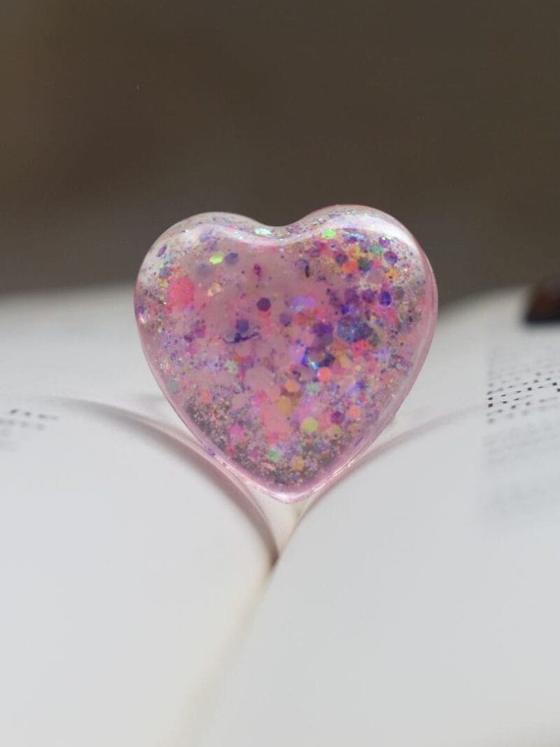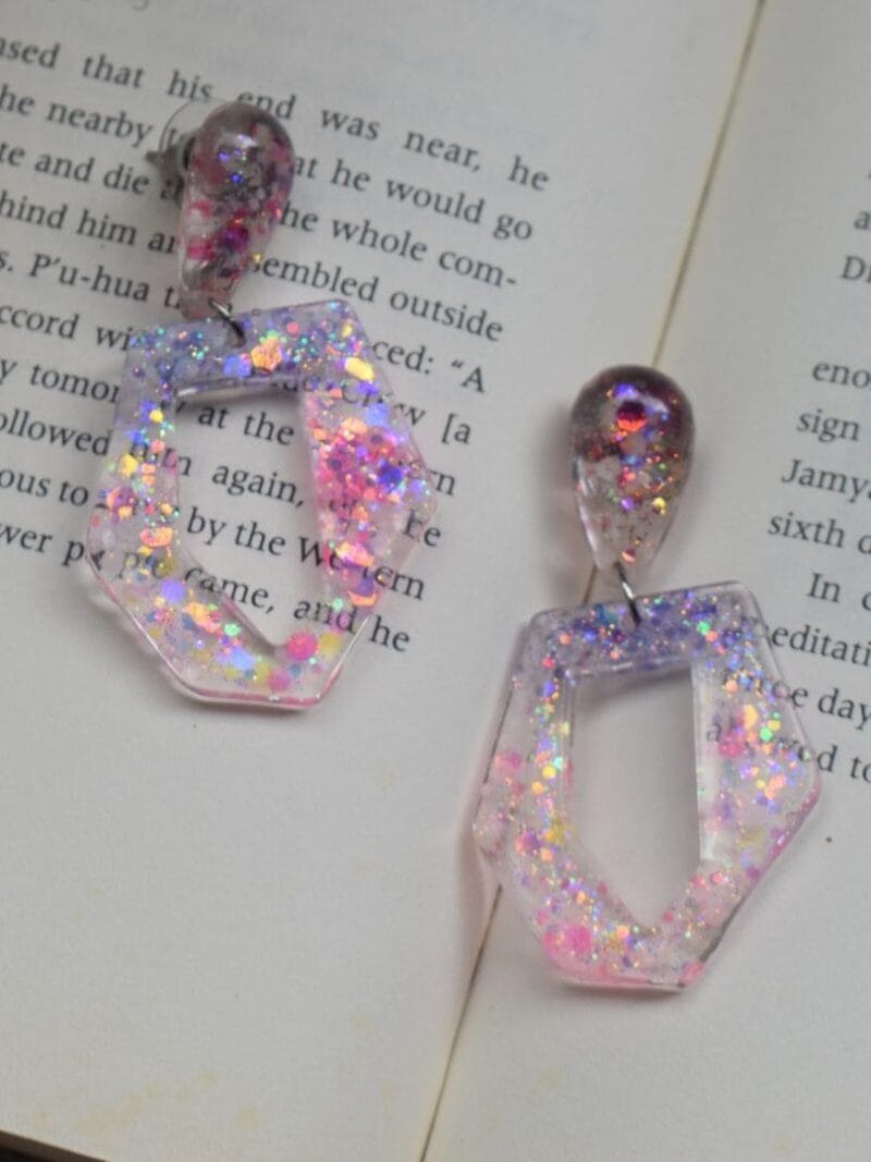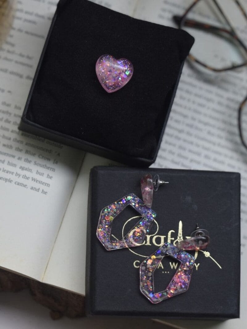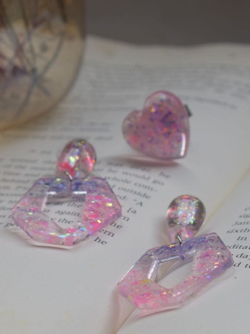 Design Inspiration: Inspired by the enchanting beauty of geometric shapes and vibrant hues, this set is perfect for adding a playful yet elegant touch to any outfit. This charming set features a heart-shaped ring and a pair of earrings adorned with mesmerizing pink and blue glitter, creating a mesmerizing kaleidoscope of colors that sparkles with every movement. Whether you’re dressing up for a special occasion or adding a pop of color to your everyday look, the Polygon Set is sure to make a statement.