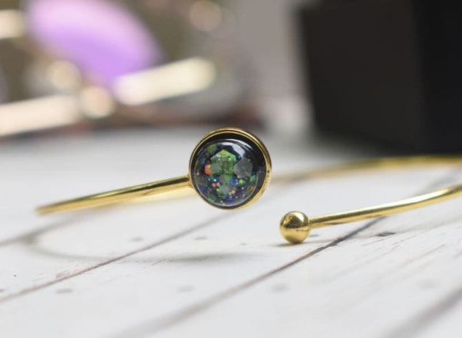 Materials: Glitter, Pigment, Resin, Gold Plated Handcuff