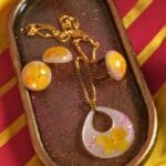 Design Inspiration: Inspired by the golden glow of a summer’s day, this collection captures the essence of sunshine and blooms. Each piece is adorned with a pearl white pigment, reminiscent of the purity of sunlight filtering through leaves. At the heart of this ensemble lies the exquisite yellow Hydrangea dry flower, preserved to immortalize its vibrant petals in everlasting splendor. Adding a touch of enchantment, multi-colored glow-in-the-dark glitter dances within the confines of each piece, illuminating the wearer with a captivating aura.