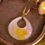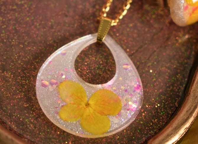 Materials: Resin, Pressed Flower, Holographic Glitter, Pearl Pigment, Gold Plated Base