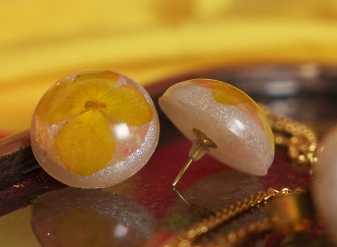 Materials:Resin, Pressed Flower, Holographic Glitter, Pearl Pigment, Gold Plated Flat Post Back