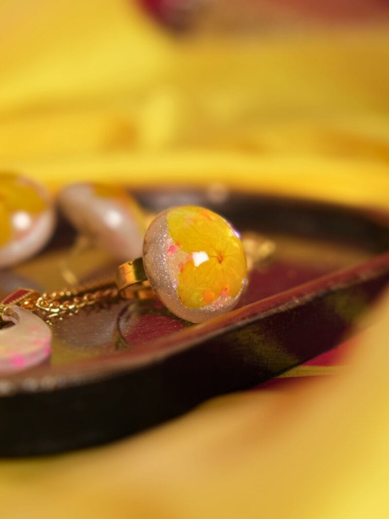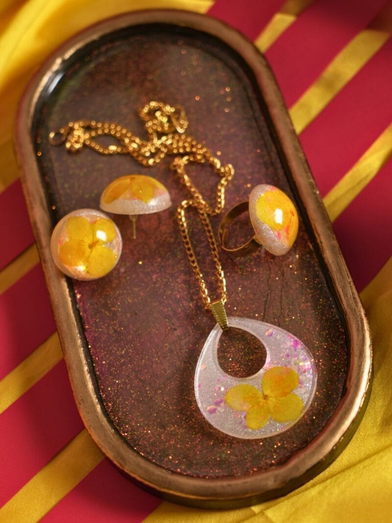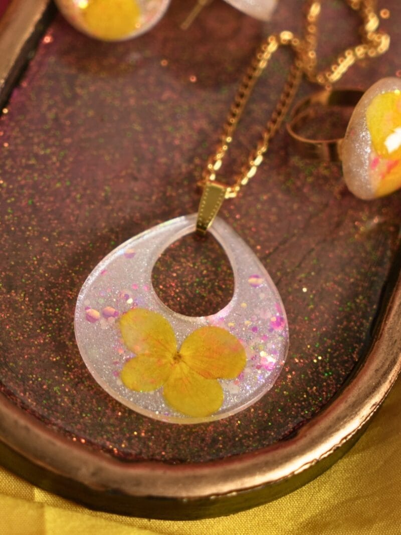 Design Inspiration: Inspired by the golden glow of a summer’s day, this collection captures the essence of sunshine and blooms. Each piece is adorned with a pearl white pigment, reminiscent of the purity of sunlight filtering through leaves. At the heart of this ensemble lies the exquisite yellow Hydrangea dry flower, preserved to immortalize its vibrant petals in everlasting splendor. Adding a touch of enchantment, multi-colored glow-in-the-dark glitter dances within the confines of each piece, illuminating the wearer with a captivating aura.