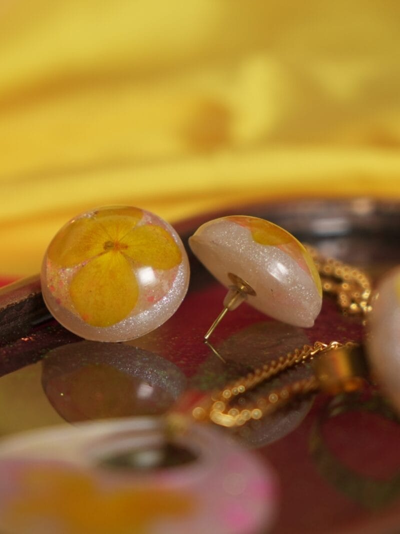 Materials:Resin, Pressed Flower, Holographic Glitter, Pearl Pigment, Gold Plated Flat Post Back