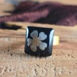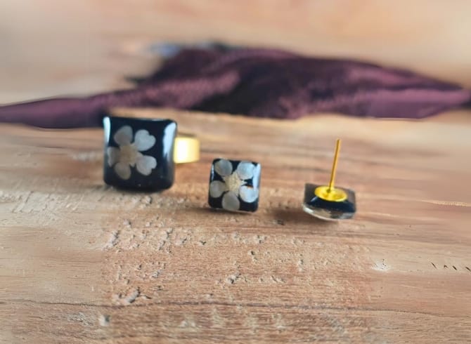 Design Inspiration: Inspired by the classic elegance of black and white, the White Floral Ring and Earring Set embodies the beauty of contrasts. The set showcases real white plum flowers preserved in clear resin, highlighting their delicate beauty against a backdrop of bold black pigment. This juxtaposition of light and dark creates a dramatic, yet refined look that is both versatile and sophisticated. It’s a celebration of the harmonious balance between simplicity and boldness.