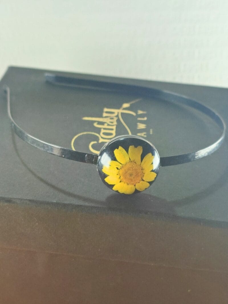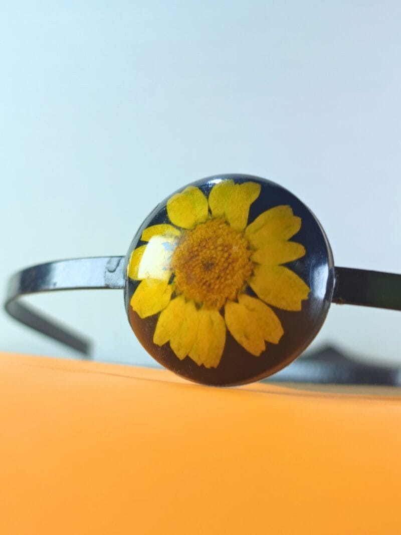 Design Inspiration: Inspired by the warmth of the season, our Yellow Daisy Hairband is perfect for adding a pop of color to any outfit. Crafted with a captivating yellow Daisy dry flower and accented by bold black pigment, this round hairband is a statement piece that exudes confidence and style.